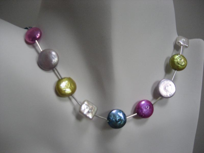 It is difficult to believe that these are freshwater pearls, isn't it? Red coin pearls, peacock blue square pearls, and white hexagon pearls hold hands on this stunning necklace.