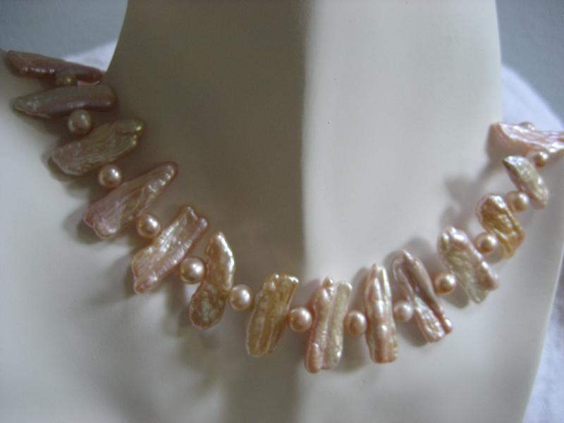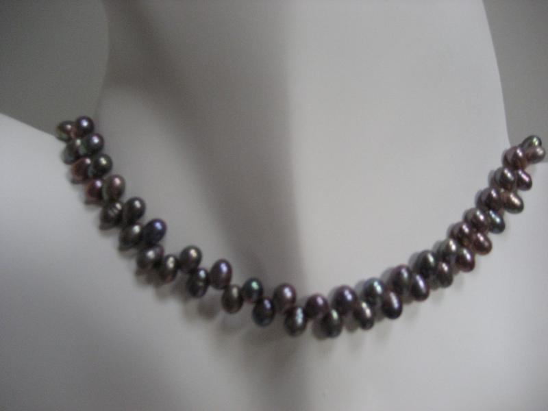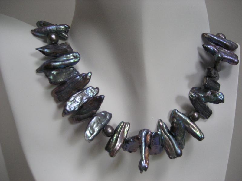 Freshwater biwa pearls in peacock color join with peacock rounds to display a fabulous necklace.