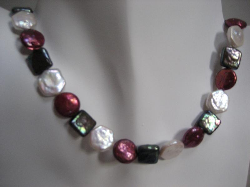 It is difficult to believe that these are freshwater pearls, isn't it? Red coin pearls, peacock blue square pearls, and white hexagon pearls hold hands on this stunning necklace.