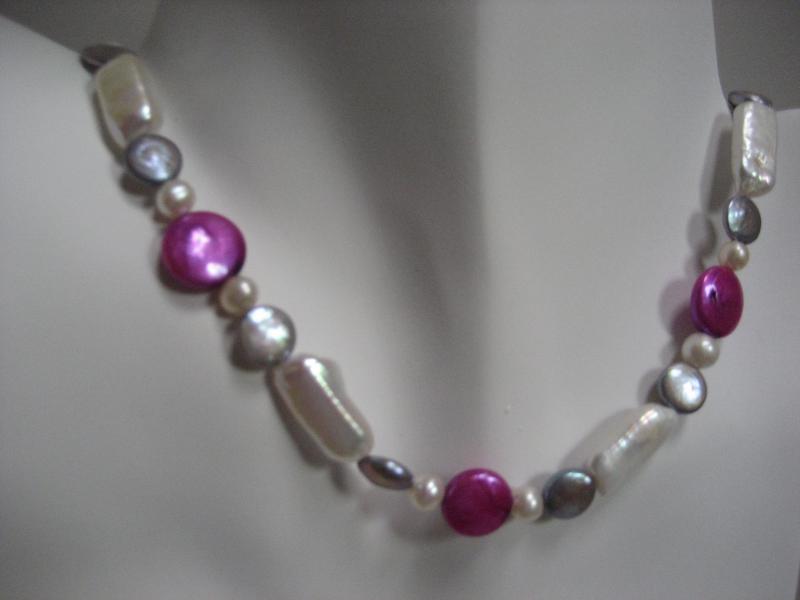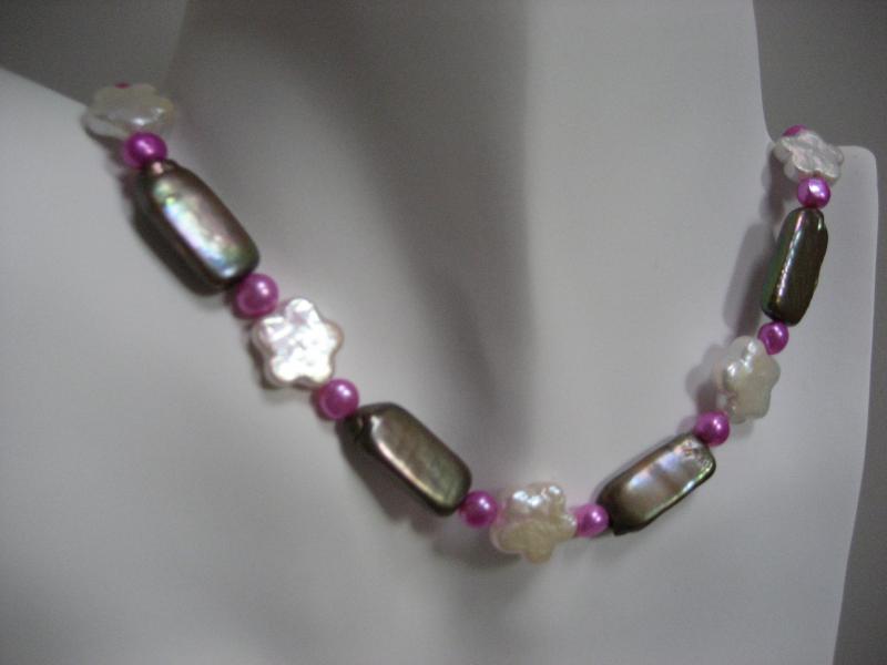 Freshwater silver biwa pearls are accented by white flower pearls and hot pink round pearls for an updated look.