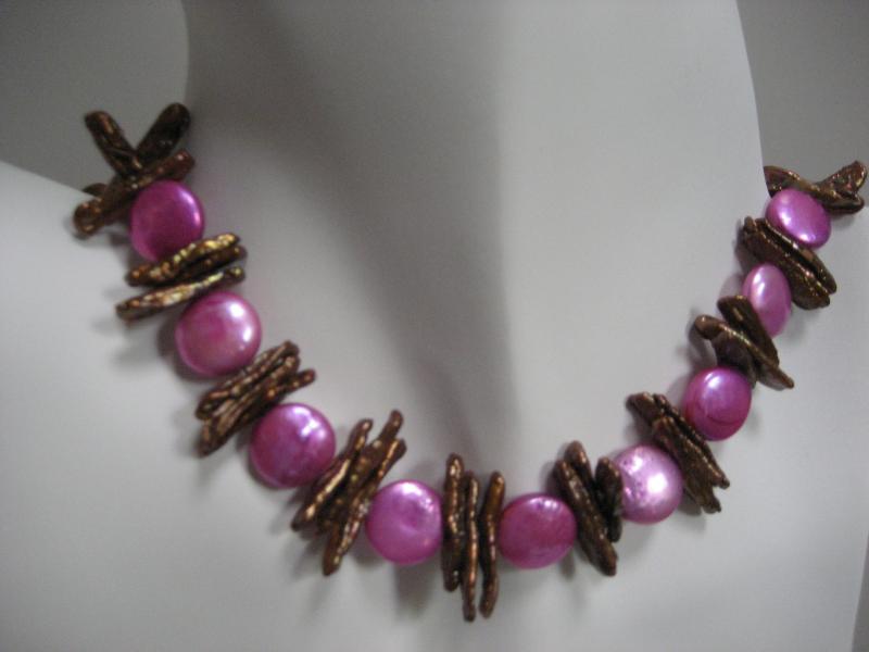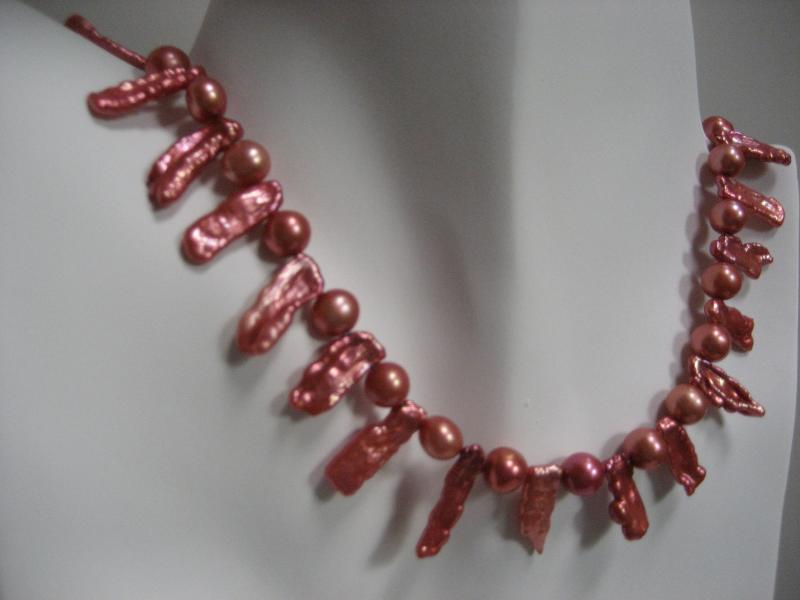Coral biwa pearls alternate with round pearls of a similar color to accent that little black dress.